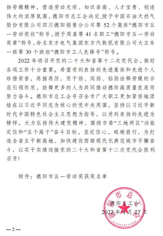 在4月27日德陽市總工會文件中,四川中衡檢測技術(shù)有限公司在《關(guān)于表揚德陽市五一勞動獎和命名工人先鋒號的通報》里,受到了“德陽市五一勞動獎狀”的表彰。
