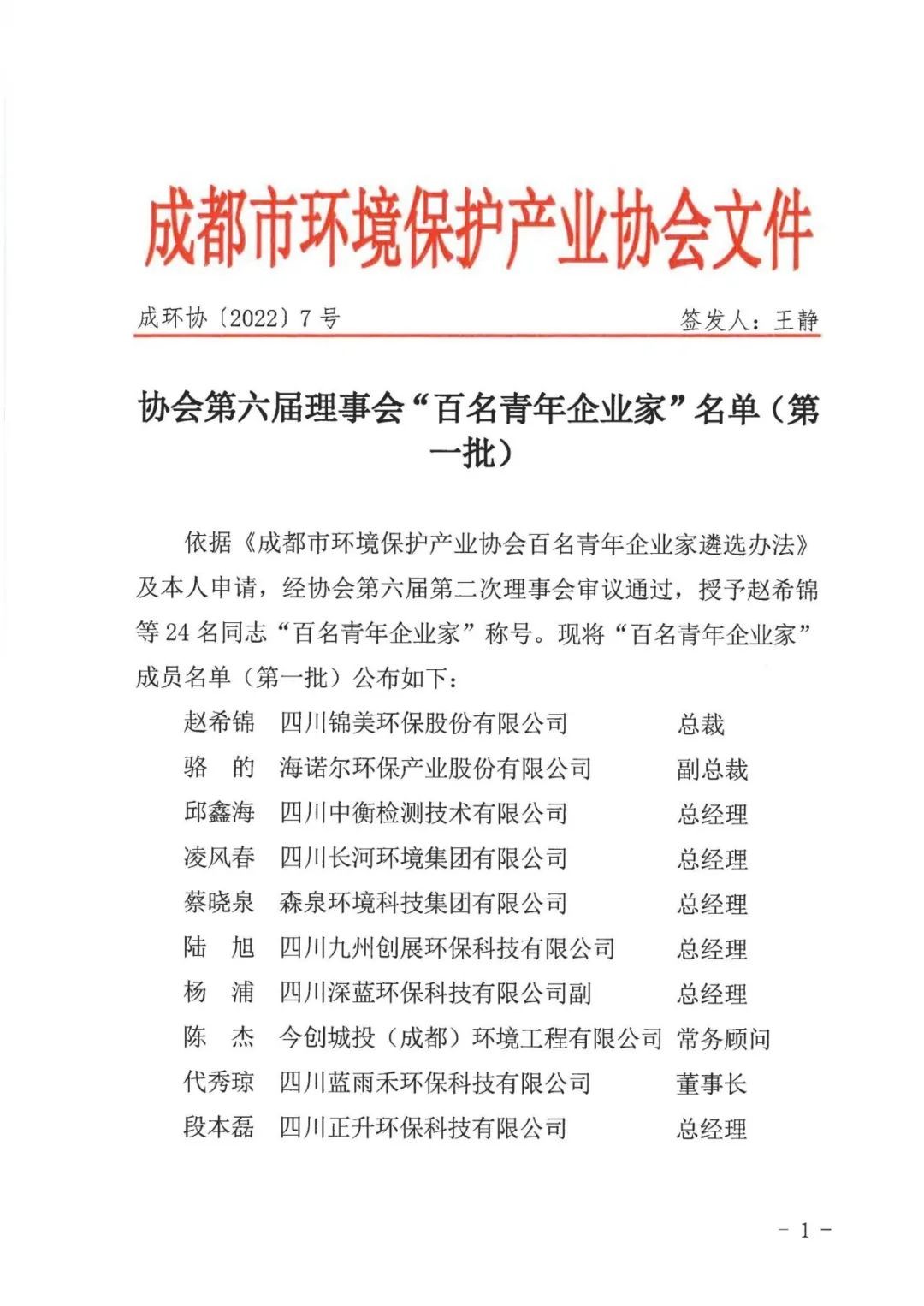 成都市環(huán)境保護產(chǎn)業(yè)協(xié)會于近日公布了協(xié)會第六屆理事會“百名青年企業(yè)家”名單(第一批)和“智庫成員”名單(第一批),我司總經(jīng)理邱鑫海先生均入選。