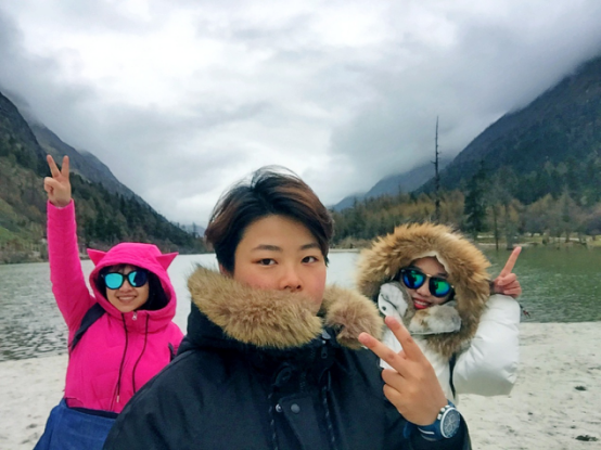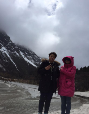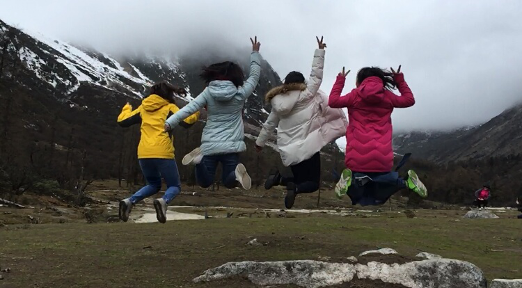 從景區(qū)門(mén)口到第一個(gè)景點(diǎn)相距20多公里,共33個(gè)急彎道,乘坐觀光大巴上去,司機(jī)大叔的車(chē)技了得,被我們戲稱(chēng)為“秋名山車(chē)神”??墒潜M管“車(chē)神”車(chē)技了得,那33道急彎的威力依然不容小覷,毫無(wú)懸念的,我們的小伙伴部分暈車(chē)了。所幸,不嚴(yán)重。下車(chē),到達(dá)景區(qū),看到大雪山的那一刻便激動(dòng)了,于是開(kāi)啟了我們拍拍拍的模式,一路走一路拍,上山的路上飄著小雪。