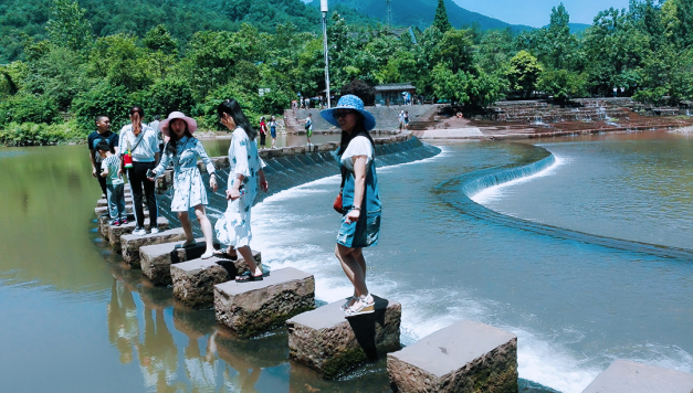 踩著間隙不一的石頭一路前行,溪水從上至下流進(jìn)河里,瞬間有種脫鞋赤腳玩水的沖動(dòng)。真是應(yīng)了那句廣告詞“透心涼,心飛揚(yáng)啊。”