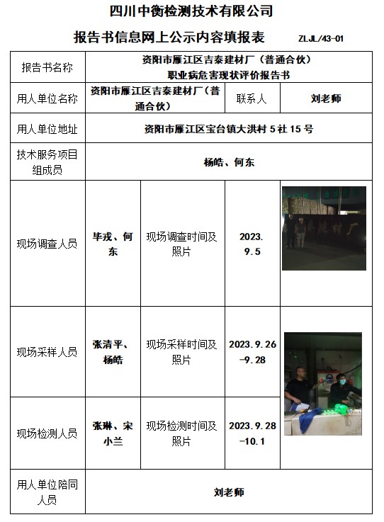 資陽市雁江區(qū)吉泰建材廠(普通合伙) 職業(yè)病危害現(xiàn)狀評價報告書