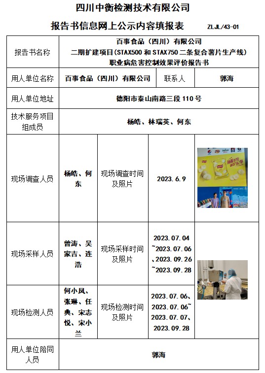 百事食品(四川)有限公司 二期擴建項目(STAX500和STAX750二條復(fù)合薯片生產(chǎn)線) 職業(yè)病危害控制效果評價報告書