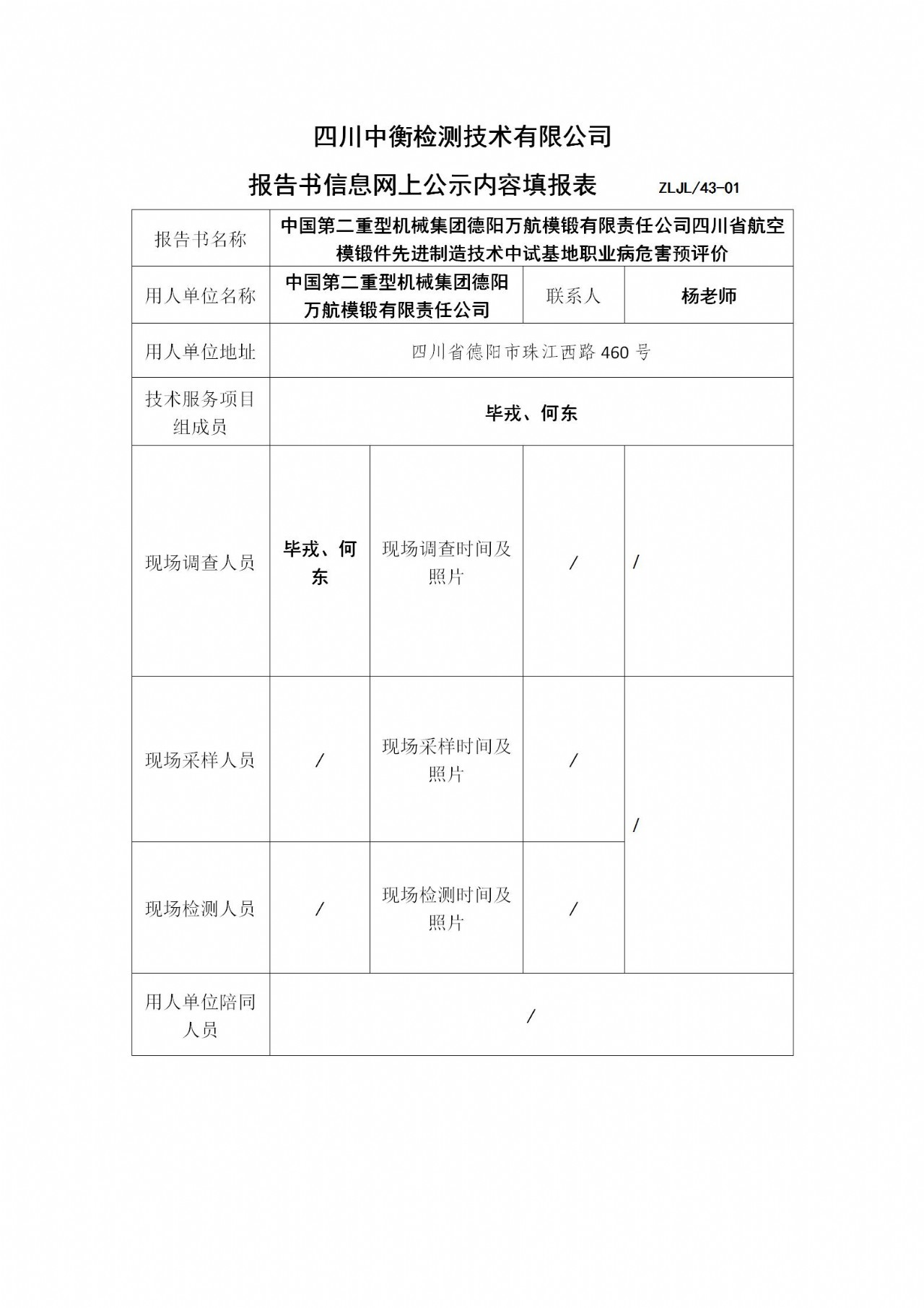 中國第二重型機械集團德陽萬航模鍛有限責(zé)任公司四川省航空模鍛件先進制造技術(shù)中試基地職業(yè)病危害預(yù)評價