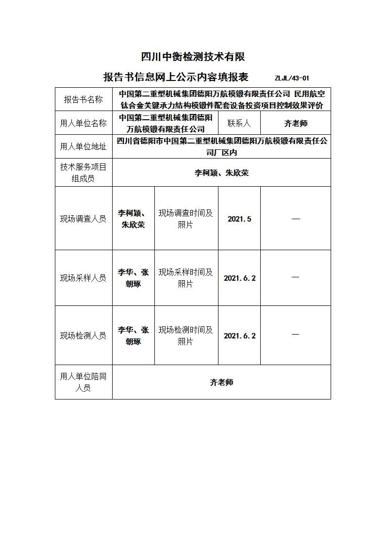 中國第二重型機(jī)械集團(tuán)德陽萬航模鍛有限責(zé)任公司 民用航空鈦合金關(guān)鍵承力結(jié)構(gòu)模鍛件配套設(shè)備投資項(xiàng)目控制效果評(píng)價(jià)