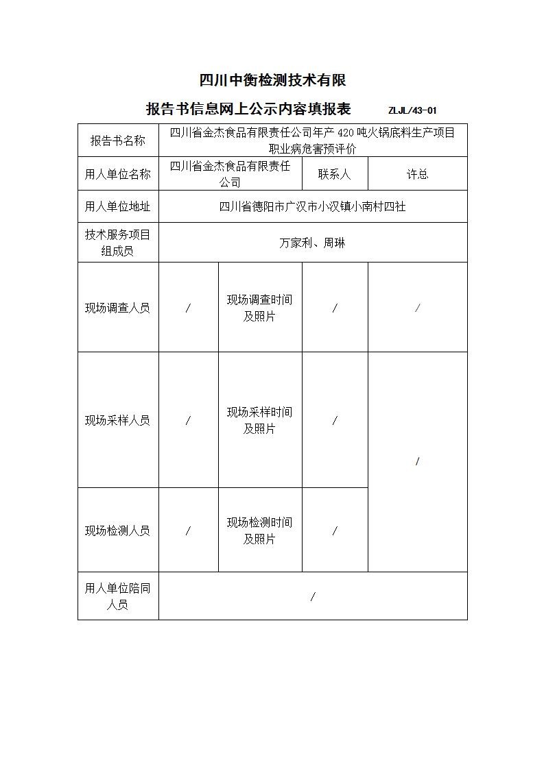 四川省金杰食品有限責(zé)任公司年產(chǎn)420噸火鍋底料生產(chǎn)項(xiàng)目職業(yè)病危害預(yù)評(píng)價(jià)