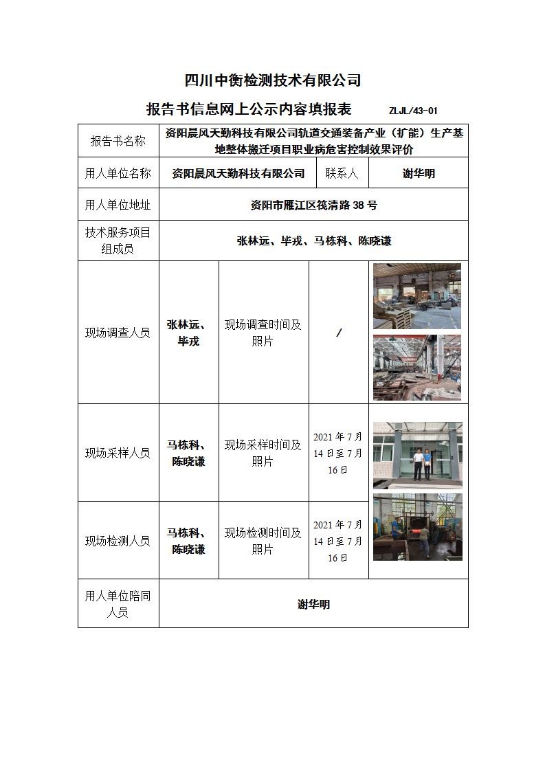 資陽(yáng)晨風(fēng)天勤科技有限公司軌道交通裝備產(chǎn)業(yè)(擴(kuò)能)生產(chǎn)基地整體搬遷項(xiàng)目職業(yè)病危害控制效果評(píng)價(jià)