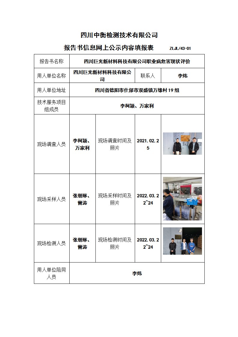 四川巨光新材料科技有限公司職業(yè)病危害現(xiàn)狀評(píng)價(jià)