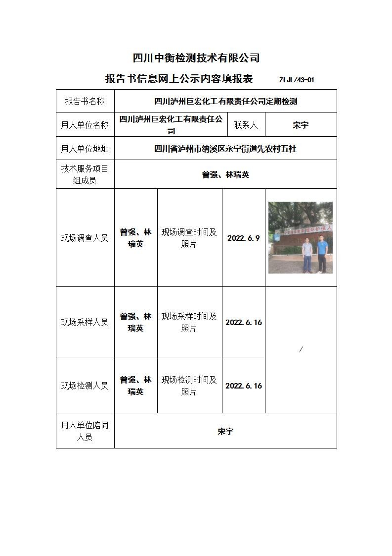 四川瀘州巨宏化工有限責(zé)任公司職業(yè)病危害定期檢測