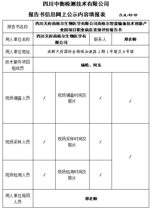 四川天府南格爾生物醫(yī)學(xué)有限公司南格爾智能輸血技術(shù)創(chuàng)新產(chǎn)業(yè)園項目職業(yè)病危害預(yù)評價
