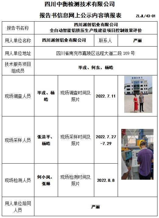 四川越創(chuàng)鋁業(yè)有限公司 全自動(dòng)智能鋁擠壓生產(chǎn)線建設(shè)項(xiàng)目控制效果評(píng)價(jià)