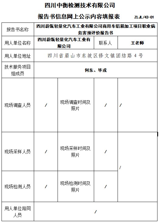 四川蔚瓴輕量化汽車(chē)工業(yè)有限公司商用車(chē)鋁箱加工項(xiàng)目職業(yè)病危害預(yù)評(píng)價(jià)