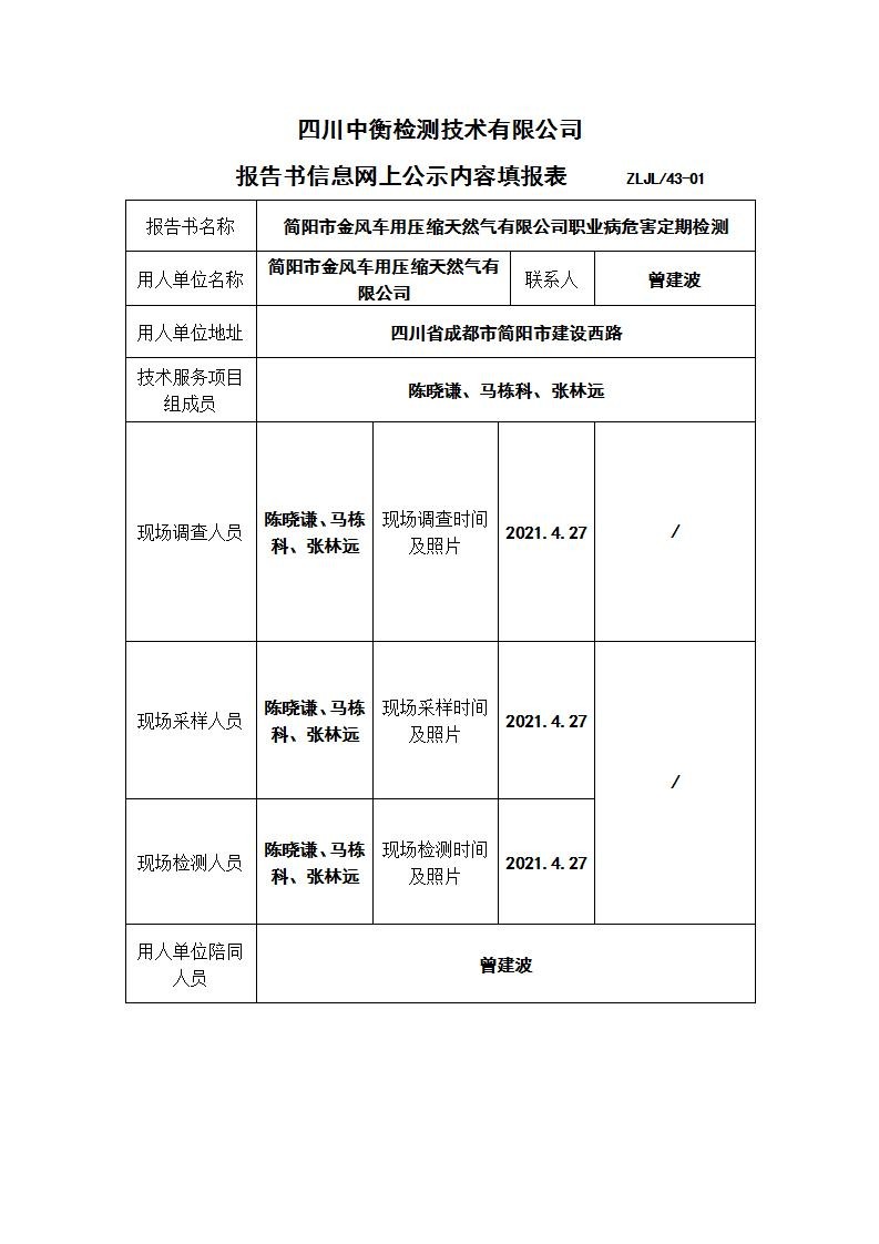 簡陽市金風車用壓縮天然氣有限公司職業(yè)病危害定期檢測