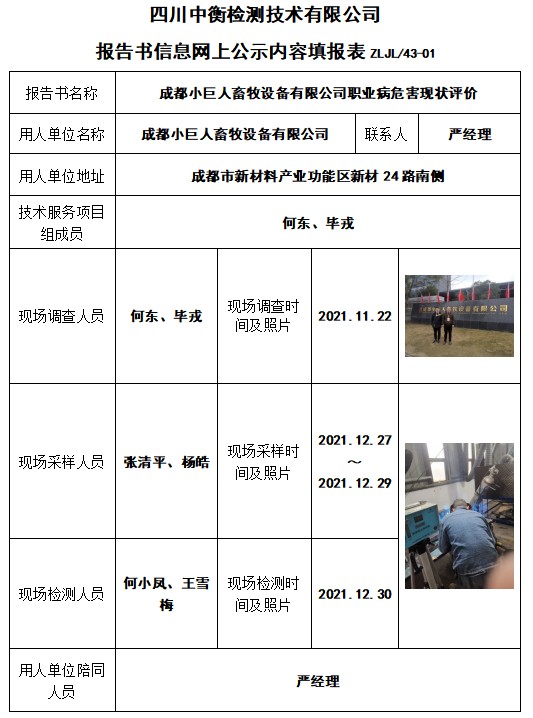 成都小巨人畜牧設(shè)備有限公司職業(yè)病危害現(xiàn)狀評價