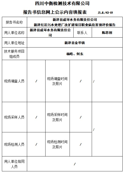 新津縣成環(huán)水務(wù)有限責(zé)任公司 新津紅巖污水處理廠改擴(kuò)建項(xiàng)目職業(yè)病危害預(yù)評價(jià)