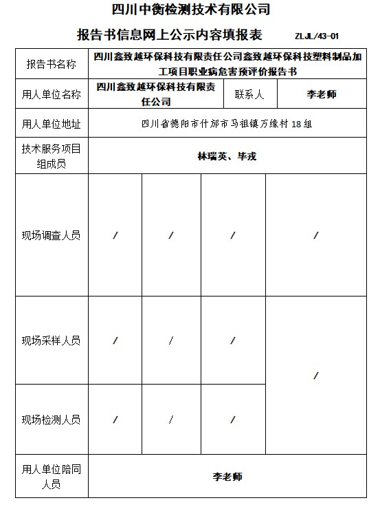 四川鑫致越環(huán)??萍加邢挢熑喂决沃略江h(huán)保科技塑料制品加工項目職業(yè)病危害預評價