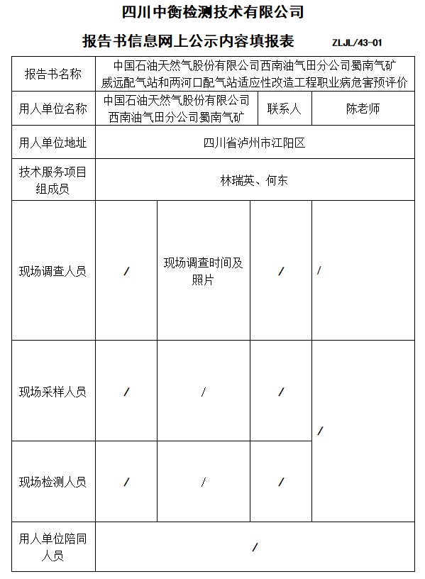 中國(guó)石油天然氣股份有限公司西南油氣田分公司蜀南氣礦 威遠(yuǎn)配氣站和兩河口配氣站適應(yīng)性改造工程職業(yè)病危害預(yù)評(píng)價(jià)