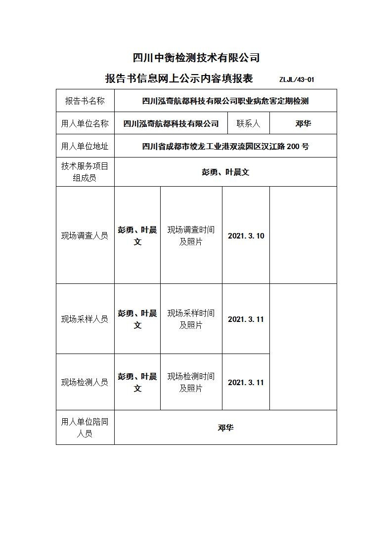 四川泓奇航都科技有限公司職業(yè)病危害定期檢測(cè)