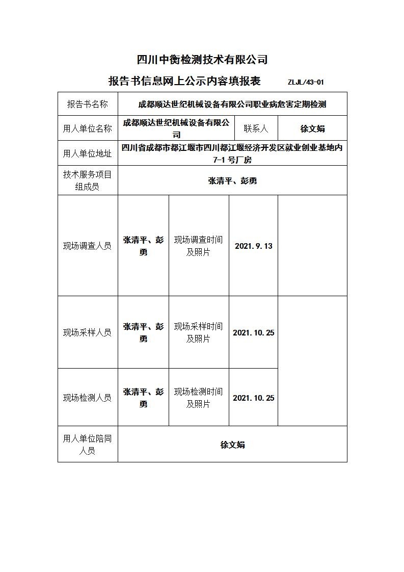 成都順達(dá)世紀(jì)機(jī)械設(shè)備有限公司職業(yè)病危害定期檢測(cè)