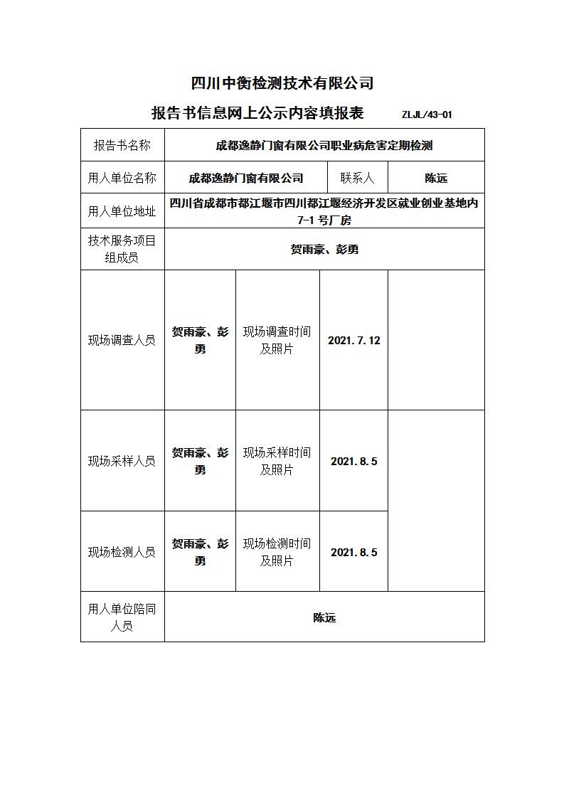 成都逸靜門窗有限公司職業(yè)病危害定期檢測(cè)