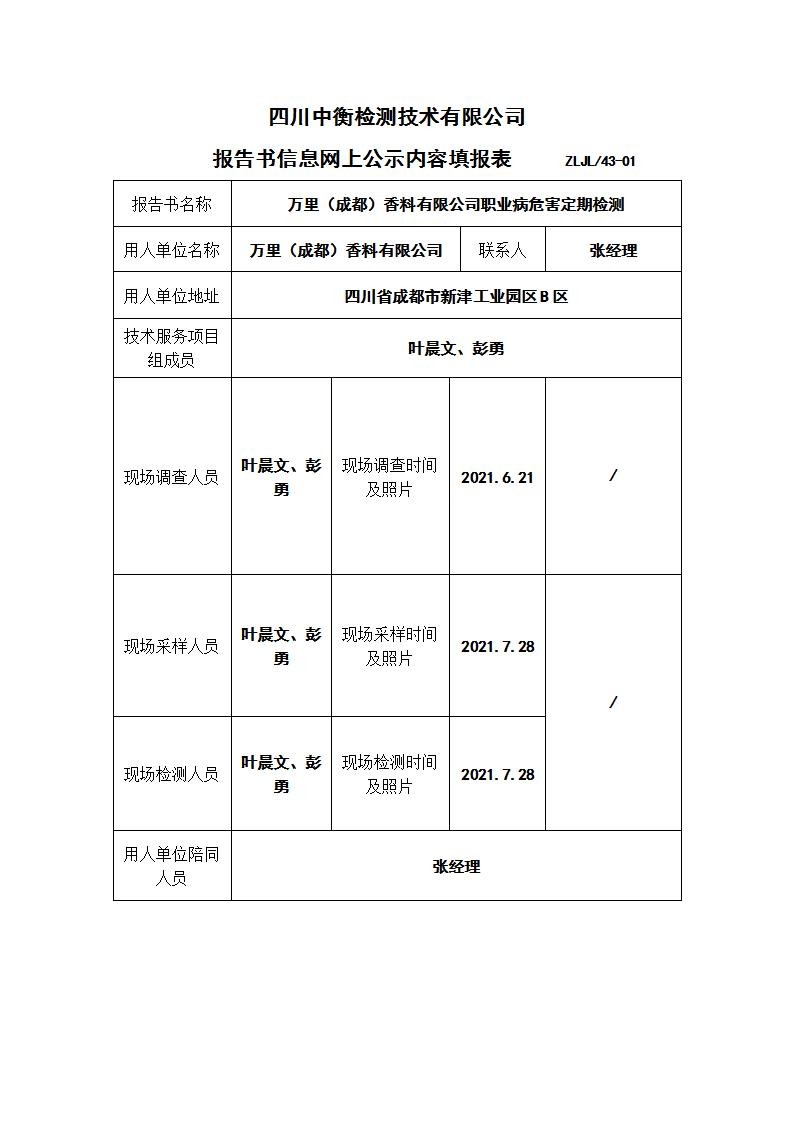 萬里(成都)香料有限公司職業(yè)病危害定期檢測