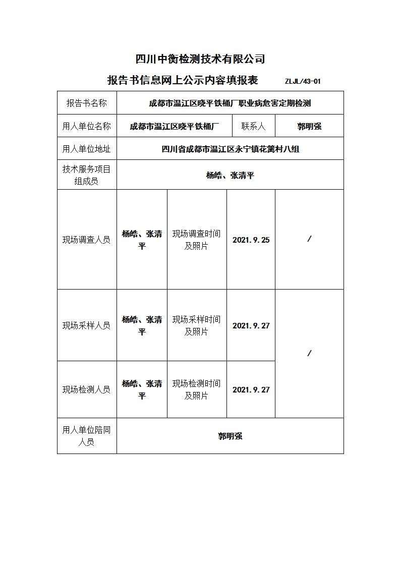 成都市溫江區(qū)曉平鐵桶廠職業(yè)病危害定期檢測