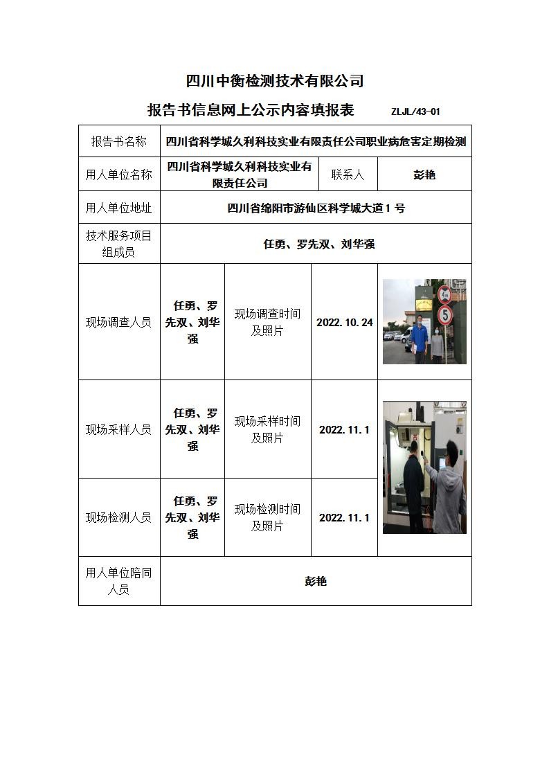 四川省科學城久利科技實業(yè)有限責任公司職業(yè)病危害定期檢測