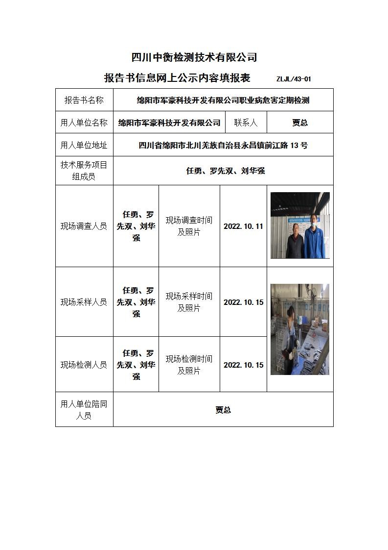 綿陽市軍豪科技開發(fā)有限公司職業(yè)病危害定期檢測