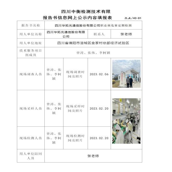 四川華拓光通信股份有限公司職業(yè)病危害定期檢測(cè)