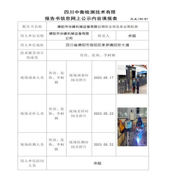 德陽市華建機械設(shè)備有限公司職業(yè)病危害定期檢測