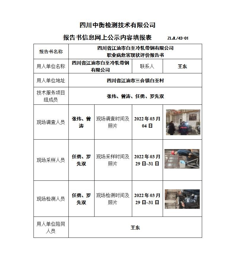 四川省江油市白至冷軋帶鋼有限公司職業(yè)病危害現(xiàn)狀評價(jià)