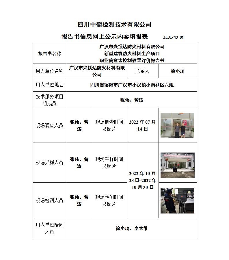 廣漢市興鎂達(dá)防火材料有限公司 新型建筑防火材料生產(chǎn)項目 職業(yè)病危害控制效果評價