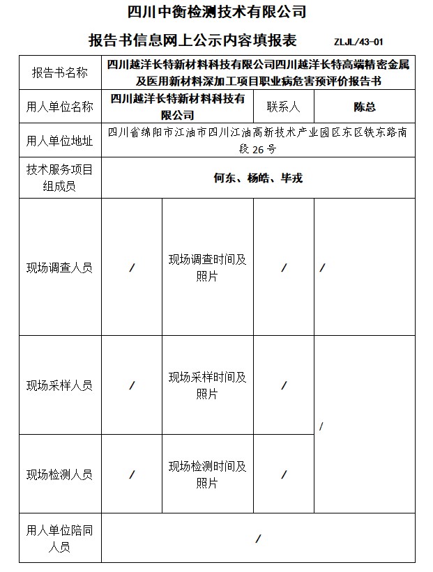 四川越洋長特新材料科技有限公司四川越洋長特高端精密金屬 及醫(yī)用新材料深加工項目預評價