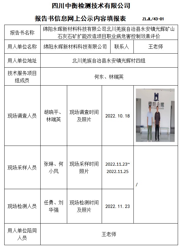 綿陽永暉新材料科技有限公司北川羌族自治縣永安鎮(zhèn)光輝礦山 石灰石礦擴(kuò)能改造項(xiàng)目控制效果評(píng)價(jià)
