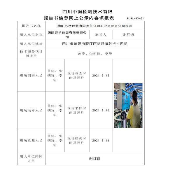 德陽蘇橋包裝有限責(zé)任公司職業(yè)病危害定期檢測(cè)