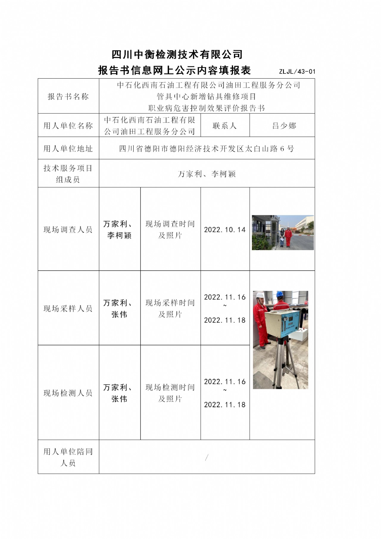 中石化西南石油工程有限公司油田工程服務(wù)分公司 管具中心新增鉆具維修項目 職業(yè)病危害控制效果評價
