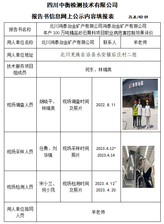 北川鴻泰冶金礦產(chǎn)有限公司鴻泰冶金礦產(chǎn)有限公司 年產(chǎn)100萬噸精品砂石骨料項(xiàng)目職業(yè)病危害控制效果評價
