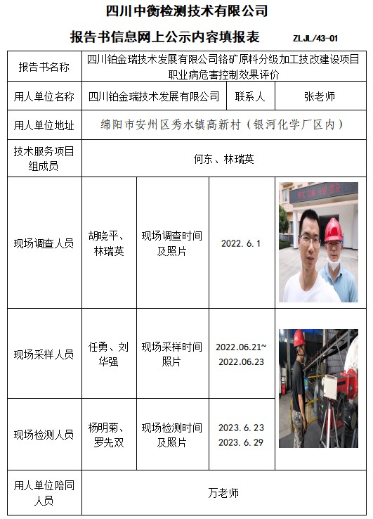 四川鉑金瑞技術發(fā)展有限公司鉻礦原料分級加工技改建設項目 職業(yè)病危害控制效果評價