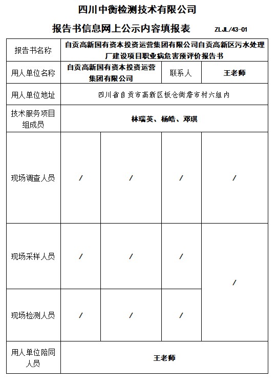 自貢高新國有資本投資運(yùn)營集團(tuán)有限公司自貢高新區(qū)污水處理廠建設(shè)項(xiàng)目職業(yè)病危害預(yù)評(píng)價(jià)報(bào)告書