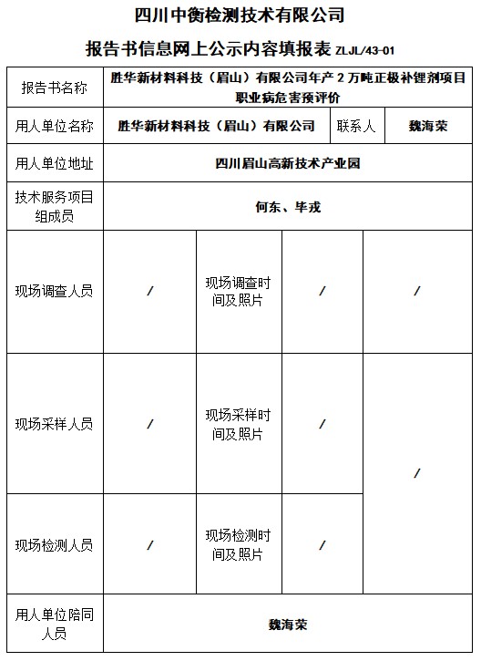 勝華新材料科技(眉山)有限公司年產(chǎn)2萬(wàn)噸正極補(bǔ)鋰劑項(xiàng)目職業(yè)病危害預(yù)評(píng)價(jià)