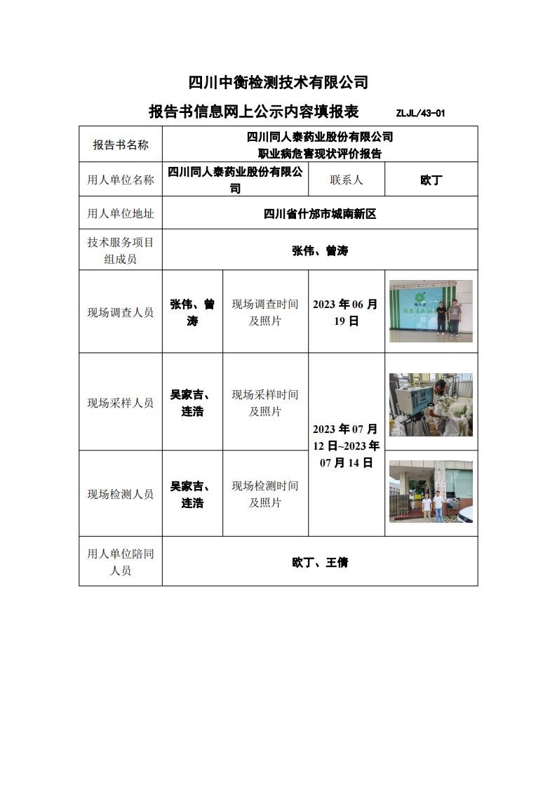 四川同人泰藥業(yè)股份有限公司職業(yè)病危害現(xiàn)狀評(píng)價(jià)