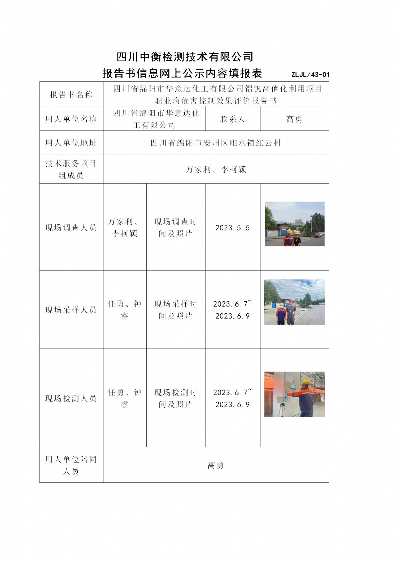 四川省綿陽市華意達(dá)化工有限公司鋁釩高值化利用項目 職業(yè)病危害控制效果評價