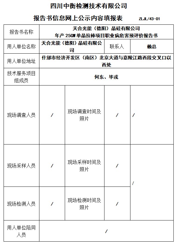 天合光能(德陽)晶硅有限公司 年產(chǎn)25GW單晶拉棒項目職業(yè)病危害預評價報告書