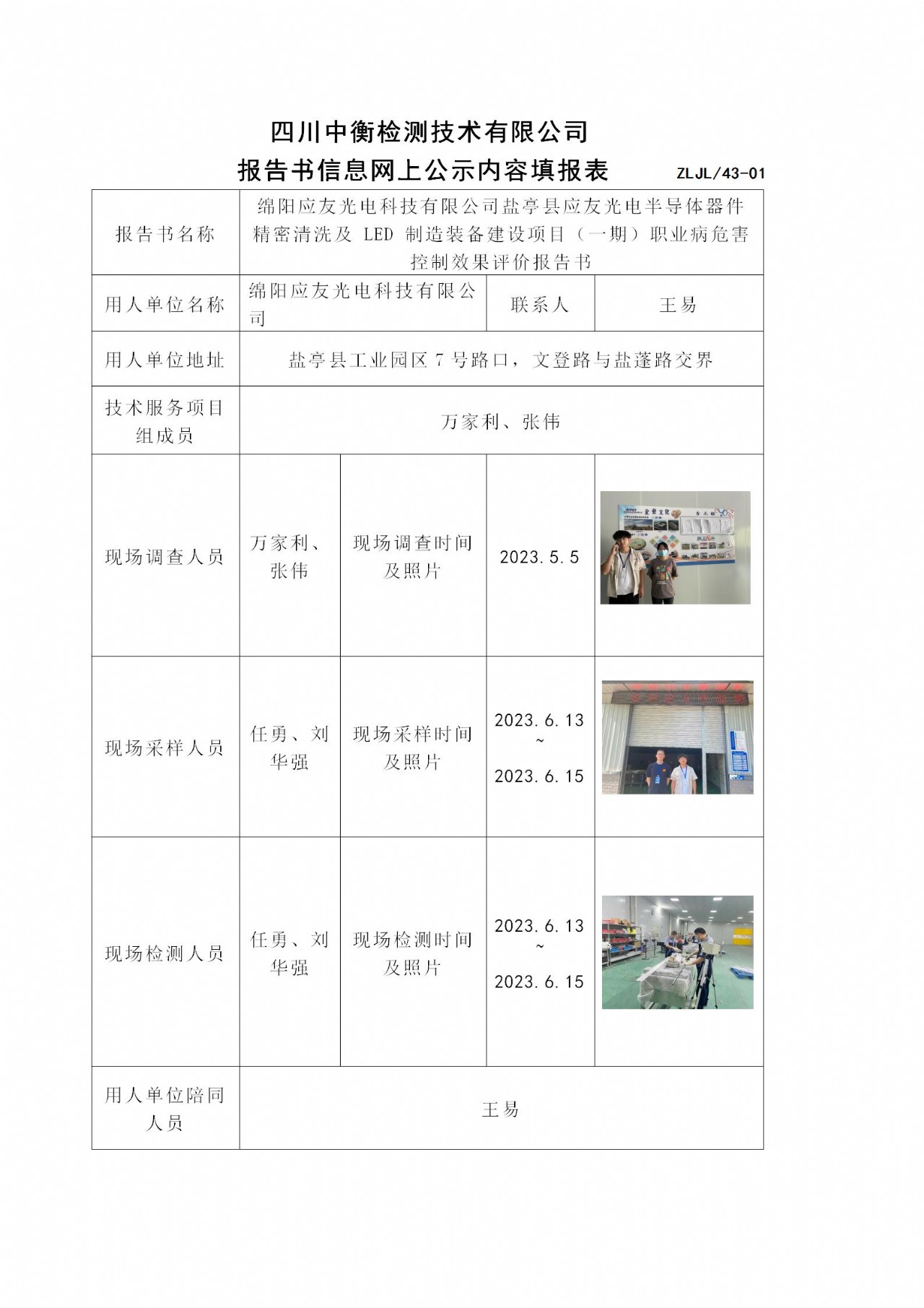 綿陽應(yīng)友光電科技有限公司鹽亭縣應(yīng)友光電半導(dǎo)體器件精密清洗及 LED 制造裝備建設(shè)項目(一期)職業(yè)病危害控制效果評價