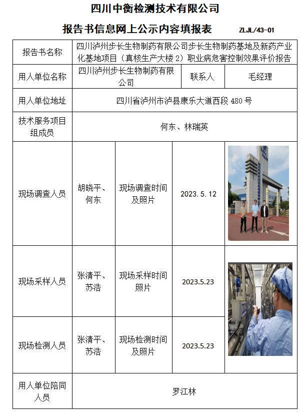 四川瀘州步長生物制藥有限公司步長生物制藥基地及新藥產(chǎn)業(yè)化基地項目(真核生產(chǎn)大樓2)職業(yè)病危害控制效果評價報告