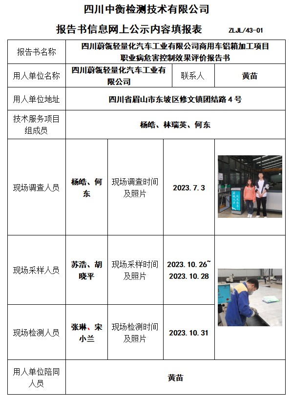 四川蔚瓴輕量化汽車工業(yè)有限公司商用車鋁箱加工項(xiàng)目 職業(yè)病危害控制效果評(píng)價(jià)報(bào)告書
