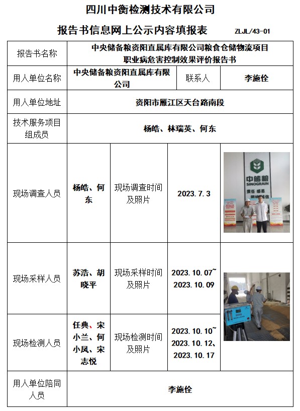 中央儲備糧資陽直屬庫有限公司糧食倉儲物流項(xiàng)目 職業(yè)病危害控制效果評價報告書