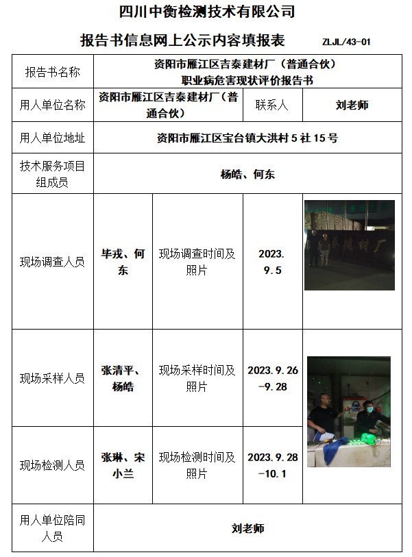 資陽市雁江區(qū)吉泰建材廠(普通合伙) 職業(yè)病危害現(xiàn)狀評(píng)價(jià)報(bào)告書