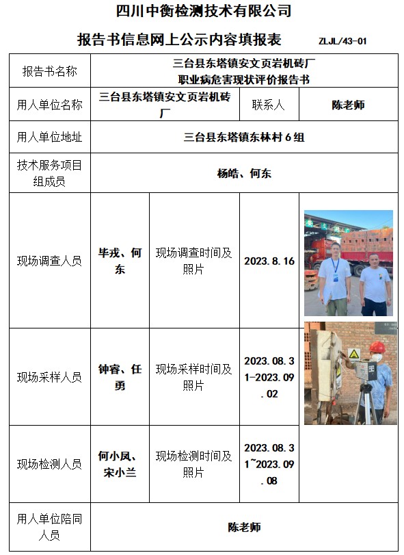 三臺縣東塔鎮(zhèn)安文頁巖機磚廠 職業(yè)病危害現(xiàn)狀評價報告書