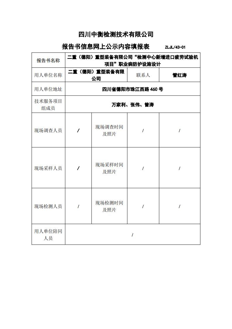 二重(德陽(yáng))重型裝備有限公司“檢測(cè)中心新增進(jìn)口疲勞試驗(yàn)機(jī)項(xiàng)目”職業(yè)病防護(hù)設(shè)施設(shè)計(jì)