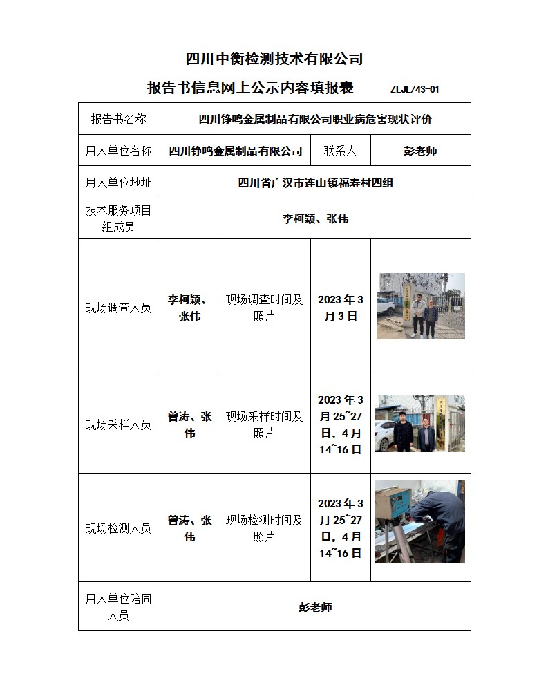 四川錚鳴金屬制品有限公司職業(yè)病危害現(xiàn)狀評(píng)價(jià)